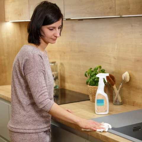 Biologicky zcela odbouratelný dezinfekční prostředek, který na rozdíl od konvenčních přípravků neobsahuje chlór ani jiné problematické chemické složky. Účinnou látkou je koncentrovaný etanol, který se po aplikaci vypaří, nezanechává nežádoucí stopy a nepůsobí žíravě ani korozivně. Díky tomu je prostředek vhodný na všechny pevné povrchy a i pro domácnosti s malými dětmi a zvířecími miláčky.
