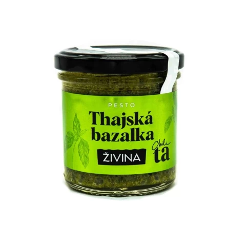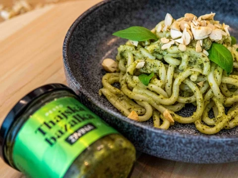 Chuťově vyladěné pesto z thajské bazalky, které jsme připravili ve spolupráci s kreativní kuchařkou Chili Ta. Do pesta jsme mimo olivového oleje přidali dýňová semínka, lahůdkové droždí a pár kapek limetkové šťávy.