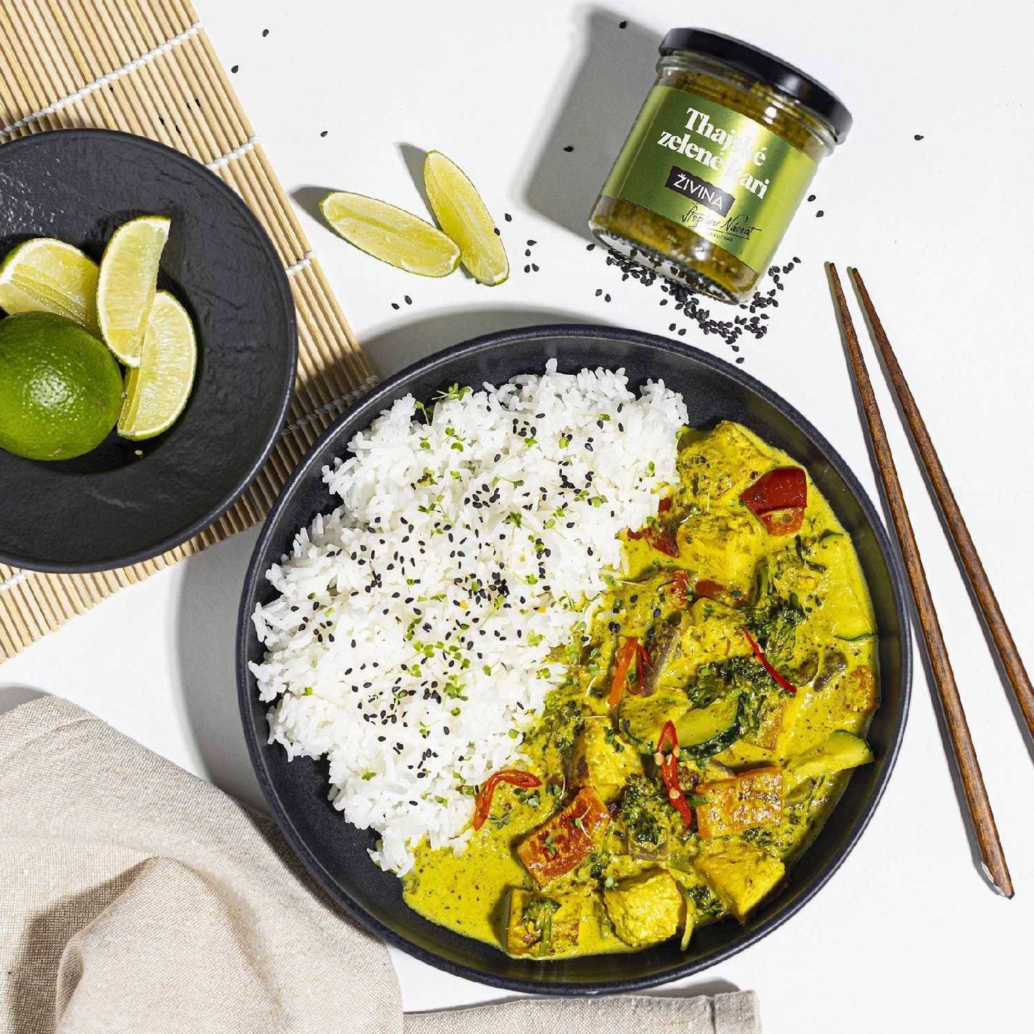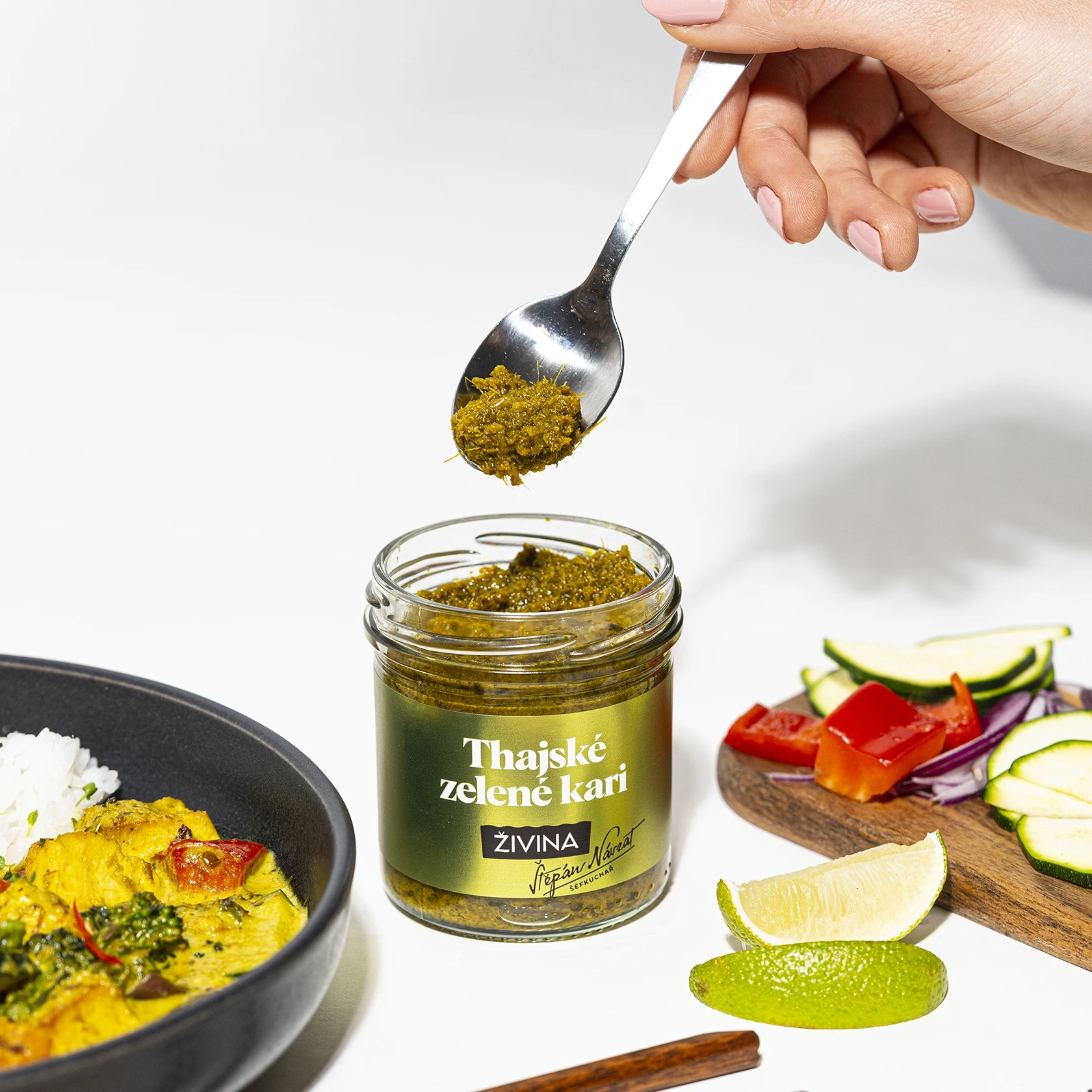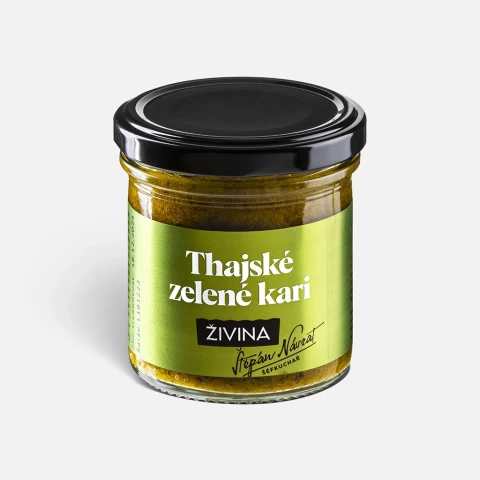 Autentické Thajské zelené kari z čerstvých surovin, které jsme uvařili ve spolupráci s šéfkuchařem a restauratérem Štěpánem Návratem. Uvařte si doma výborné thajské kari s rýží za 15 minut a pochutnejte si jako v restauraci. Jedna sklenice naší „zelené kari pasty“ vystačí na 4-6 porcí.